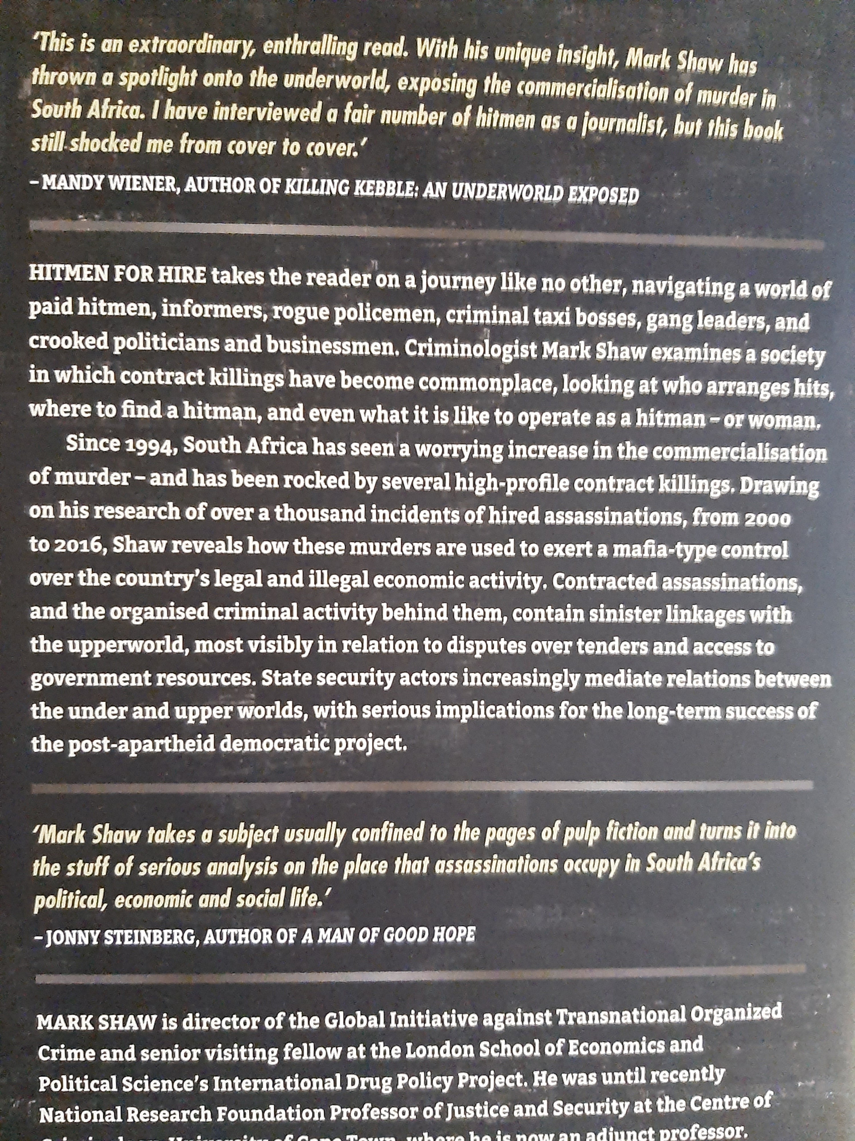 Hitmen For Hire takes the reader on a journey like no other, navigating a world of hammermen (hitmen), informers, rogue policemen, taxi bosses, gang leaders and crooked businessmen. The book examines a system in which contract killings have become the norm, looking at who arranges hits, where to find a hitman, and even what it is like to be a hitman – or woman.
