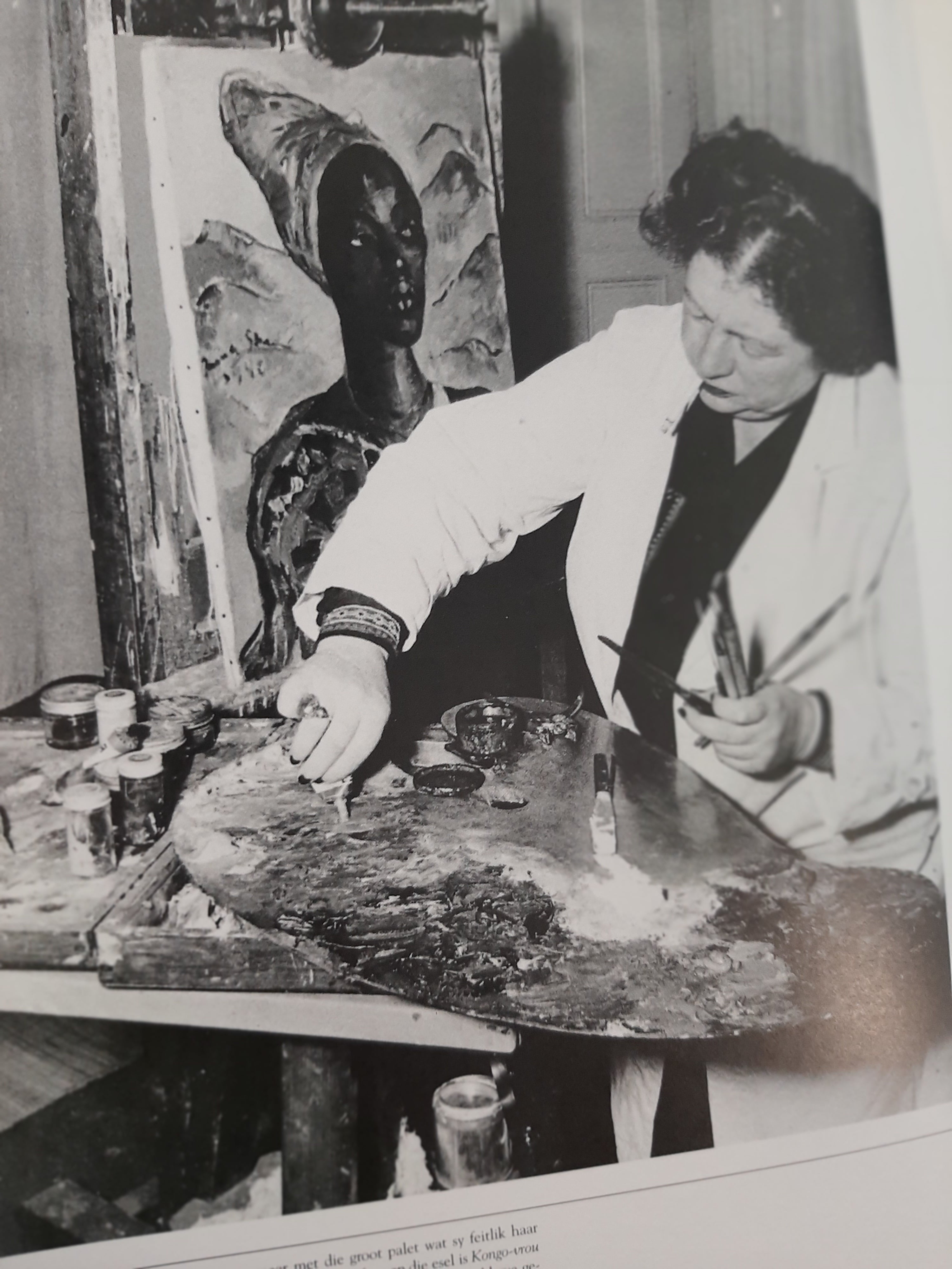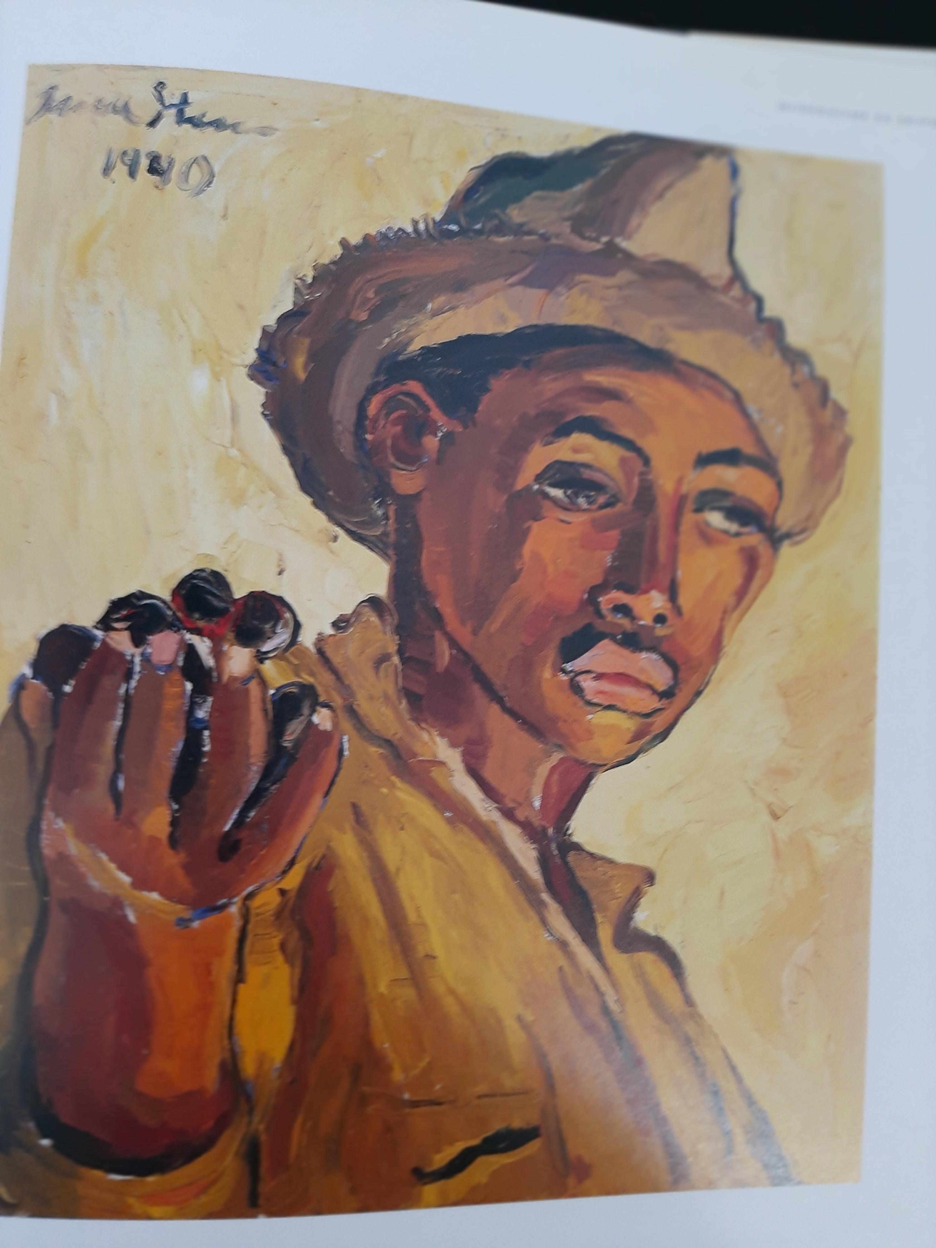 Irma Stern’s paintings are remarkable for their saturated colors and sensory nature. Her most arresting works are portraits of Africans, but she also paints landscapes and still lifes. Some of the still lifes incorporate works of African sculpture from her personal collection, e.g., “Buli stool with fruit” (1952), which depicts a Luba caryatid by the Buli master (page 146).