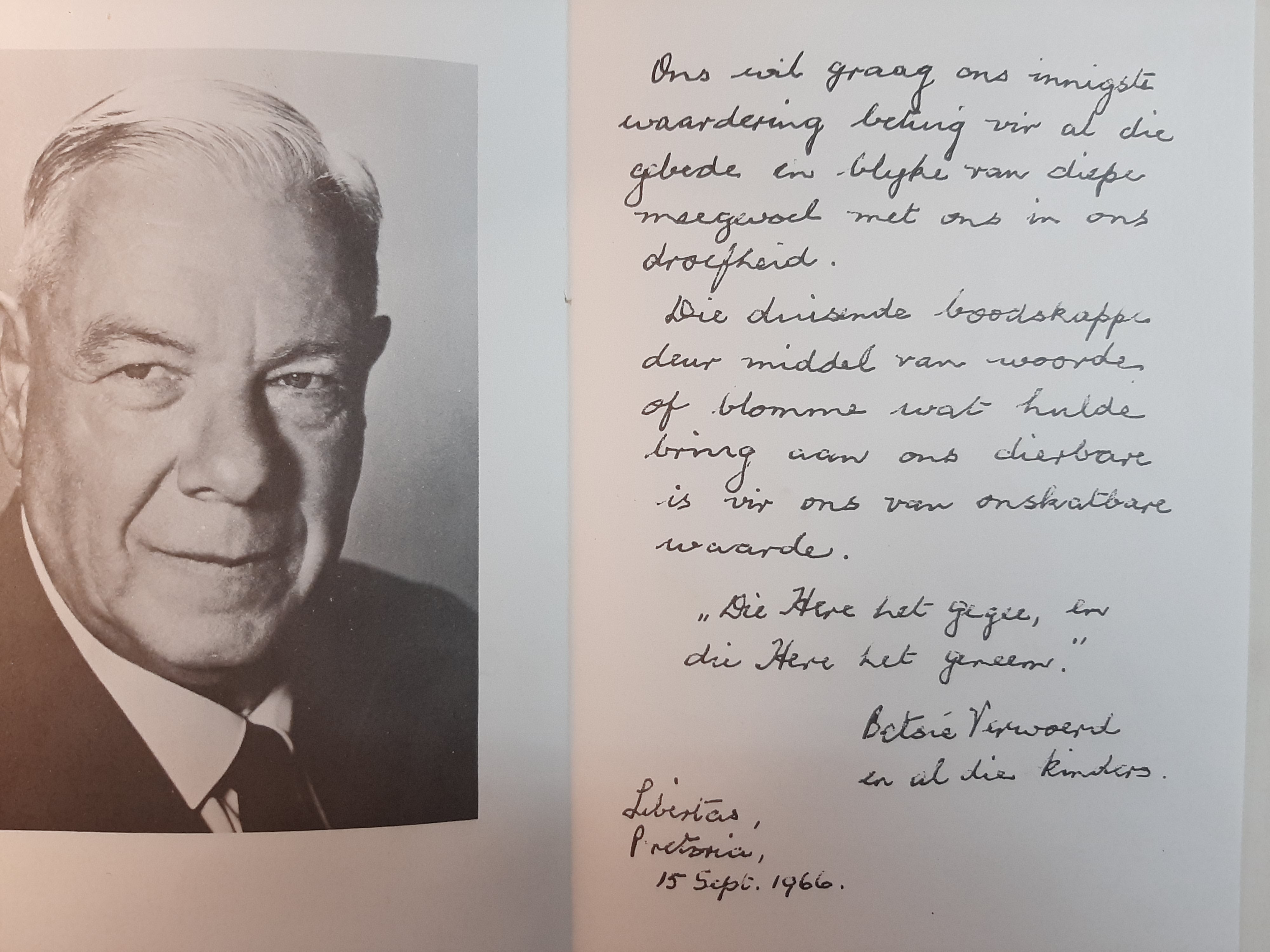 Inserted in this very Historical important book is a reproduction of a handwritten letter by the widow Betsie Verwoerd, thanking everyone who sent her messages and flowers after the passing of her husband, the Prime minister HF Verwoerd....the note includes a a picture of HF Verwoerd.