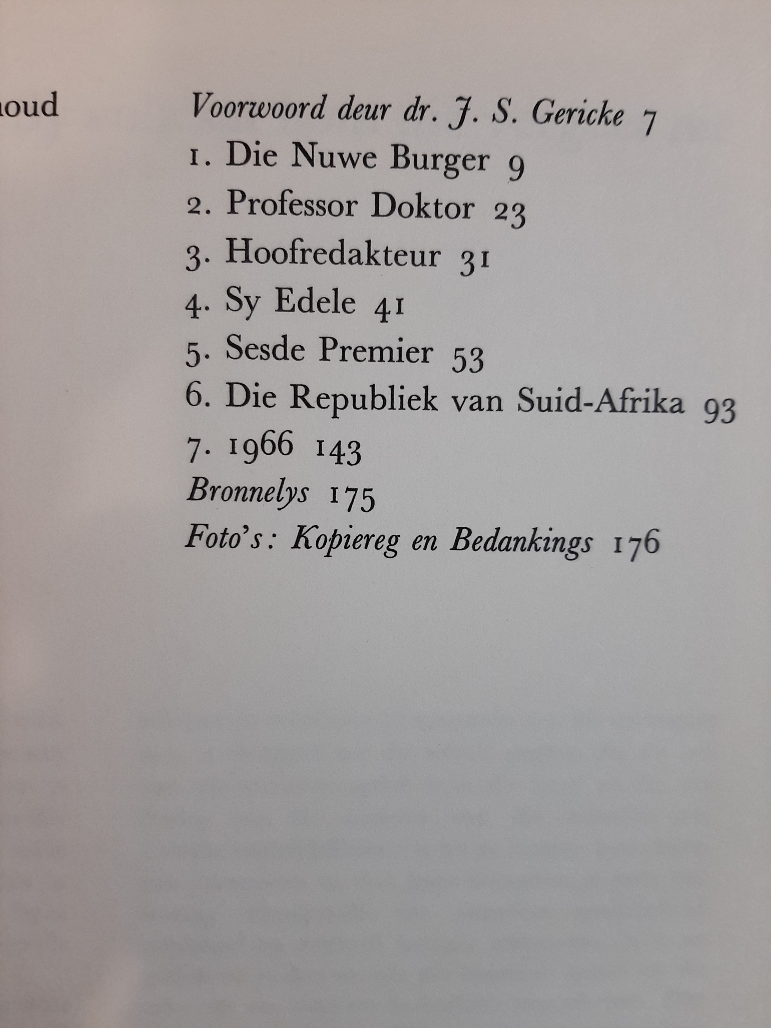 Inhoud 1. Die Nuwe Burger. 2. Professor Doktor. 3. Hoofredakteur. 4. Sy Edele. 5. Sesde Premier. 6. Die Republiek van Suid-Afrika. 7. 1966. 8. Bronnelys,