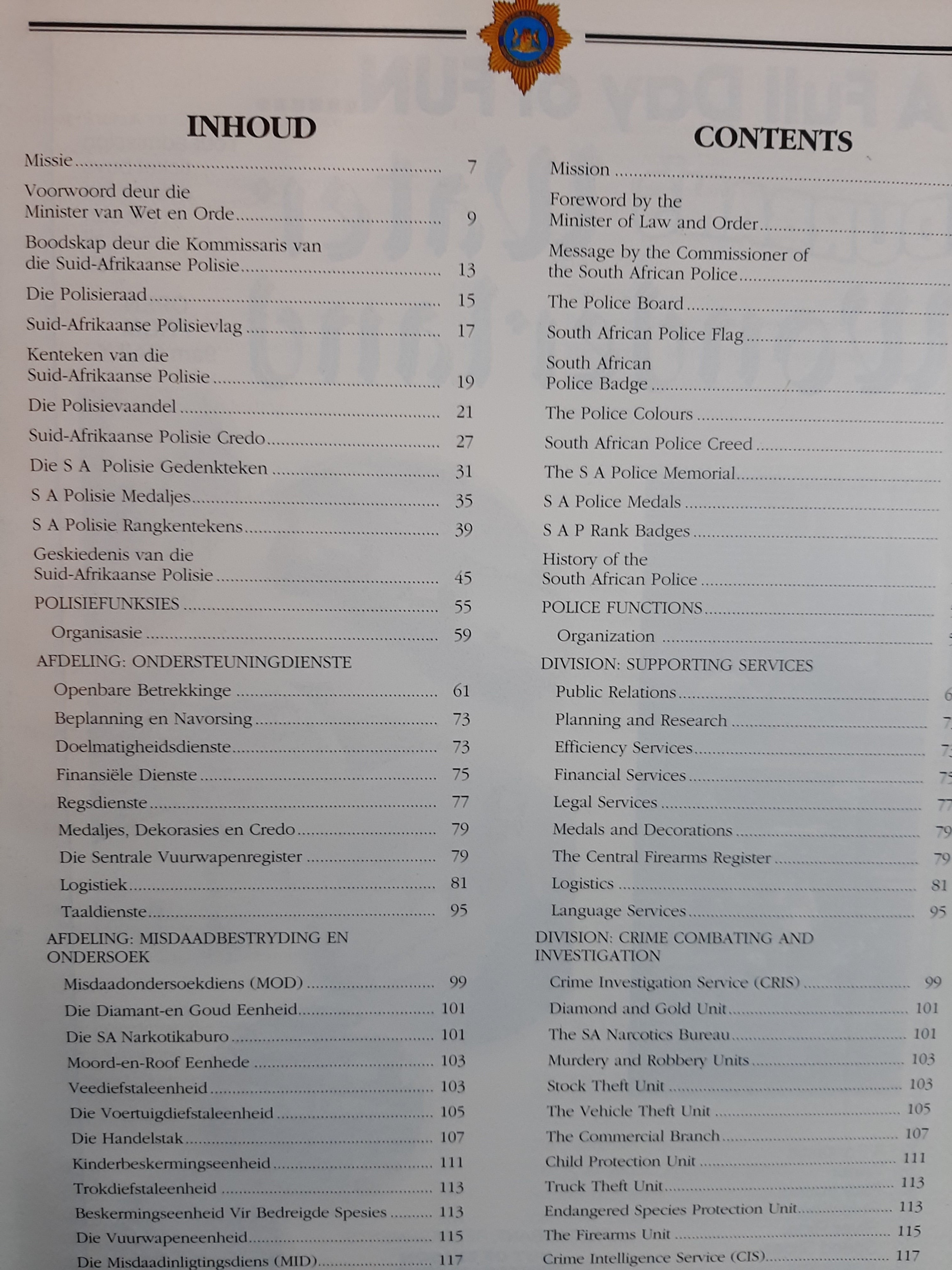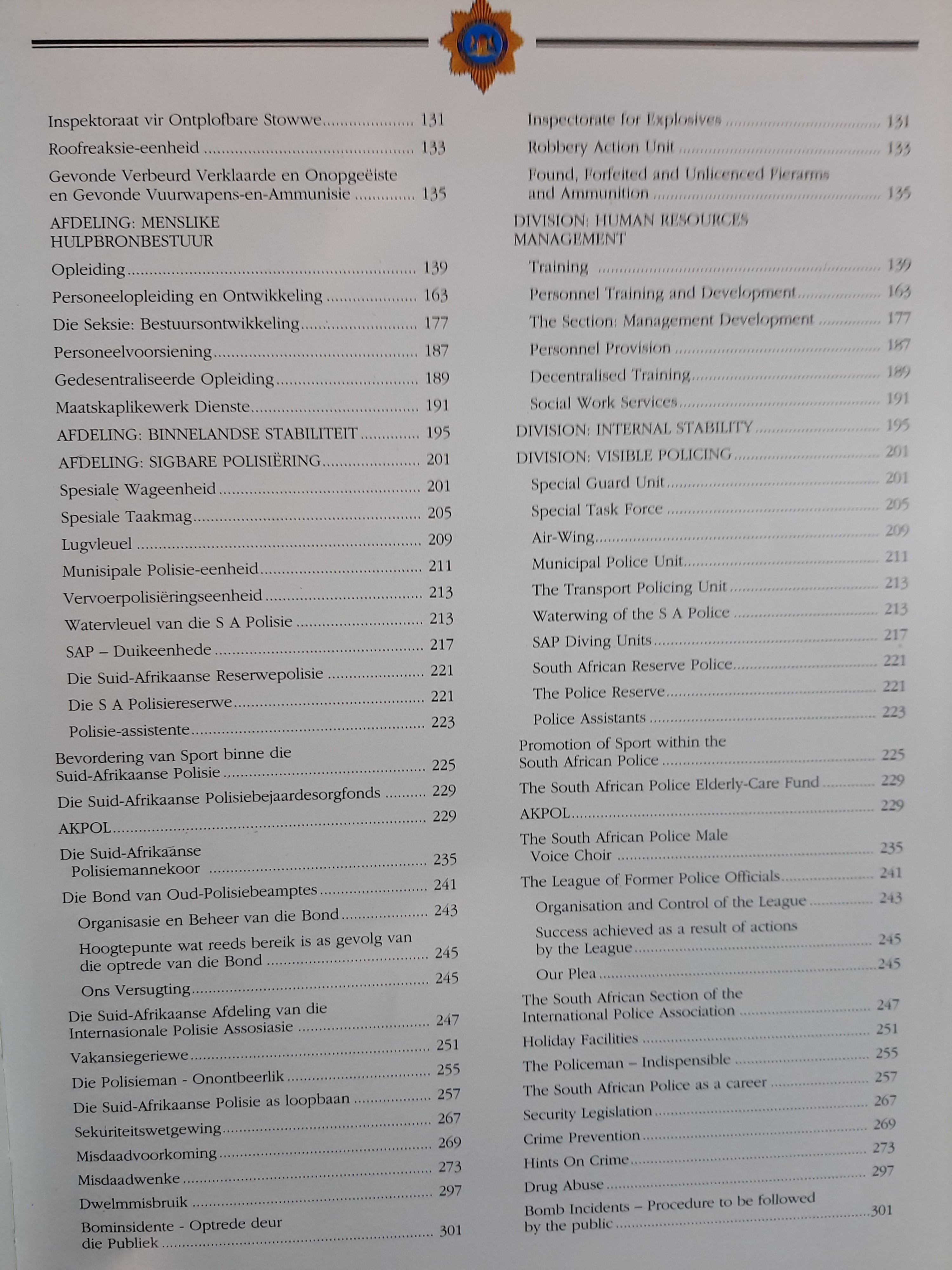This Yearbook is filled to the brim with pictures and Information of the last Year of the existence of the South African Police Force pre the 1994 amalgamation with the other Police Agencies in South Africa. This is a highly wanted piece of history of the SAP and a Collectors dream.