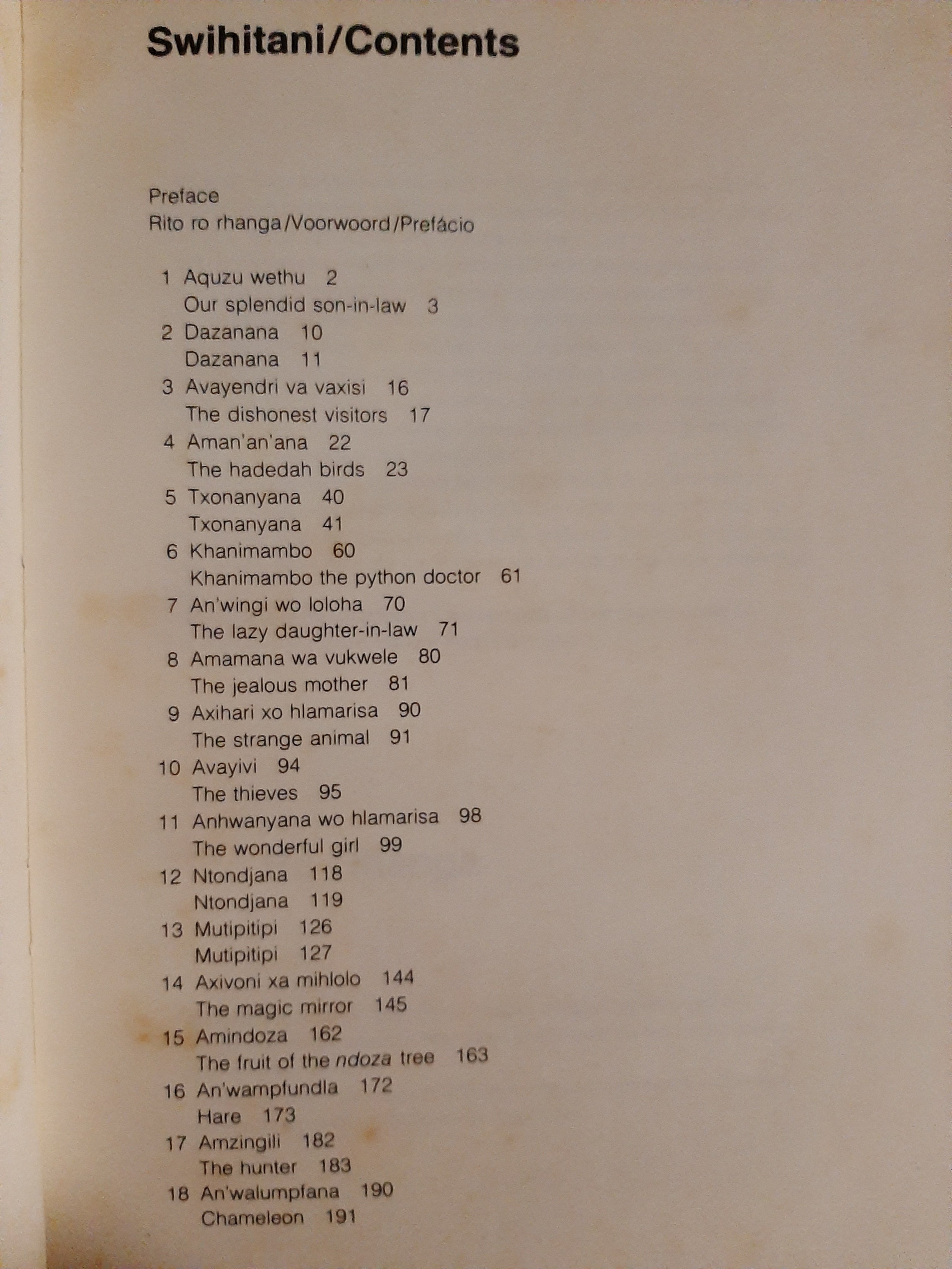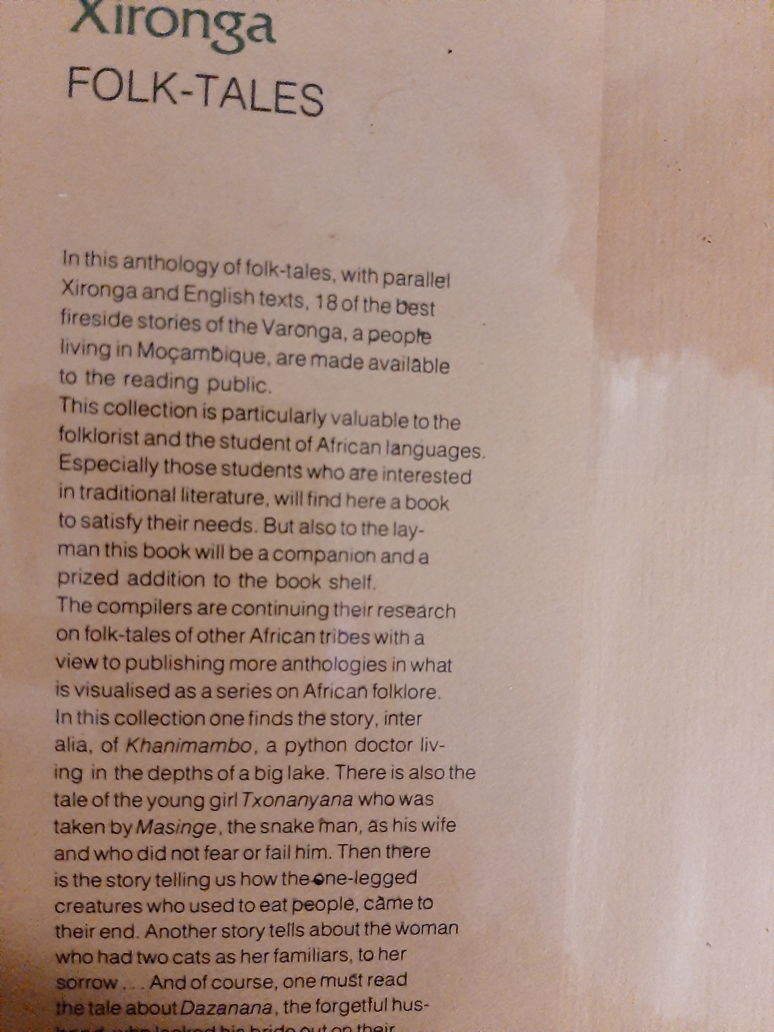 Anthology of folk-tales with parallel Xironga and English texts of 18 of the best fireside tales of the Varonga people of Mozambique. Black woodcut-style silhouette illustrations.